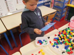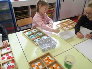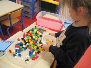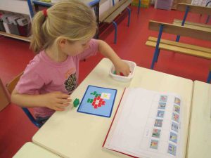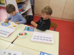 Les mardis, jeudis et vendredis après-midis, de 13h45 à 14h30, pendant qu’un groupe travaille avec Charlotte DROUART sur des jeux de stratégies et d’orientation dans l’espace, les Grands réalisent des activités pour apprendre les nombres. Ils réalisent des personnages ou des motifs en légo en utilisant une fiche technique qui leur indique le nombre exact de légos dont ils ont besoin qu’ils vont chercher au magasin de légos à l’aide d’un petit panier. Ils valident ensuite sur leur cahier de défi jeu leur construction lorsqu’elle a été réalisée avec juste assez de légos.