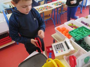 Le magasin de la classe fonctionne depuis la rentrée de Janvier. Les élèves y achètent des fruits et des légumes ! Activité qui permet avant tout de faire des mathématiques, d’apprendre le nom des fruits et légumes ce qui n’est pas toujours évident pour de nombreux enfants !