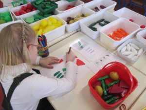 A l’aide de listes de courses avec les photos des aliments et les quantités demandées, les élèves font leurs courses et placent les aliments dans leur petit panier.