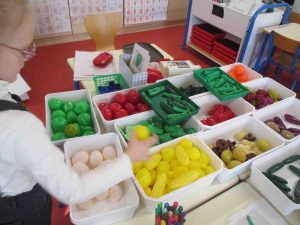 Lors d’une seconde activité, des portes monnaies ont été introduits ainsi que des pièces pour payer les courses… chaque aliment vaut une pièce. Il s’agit de prendre juste assez de pièces pour payer les aliments achetés.
