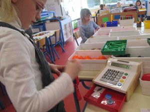 Ils se rendent ensuite auprès de la maîtresse qui tient la caisse enregistreuse et verbalisent leurs achats après avoir utilisé les formules de politesse et de savoir vivre !