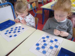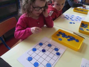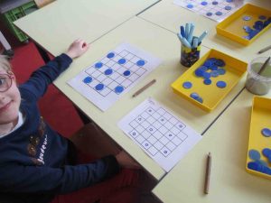 Dans toutes les classes, nous avons fait un défi: nous avons mis des jetons sur un quadrillage. La consigne était de ne pas placer de jetons dans les cases qui touchaient les cases des autres jetons par les côtés des cases ou par les coins des cases. Nous avons dessiné ce que nous avons trouvé puis cherché d’autres solutions. »