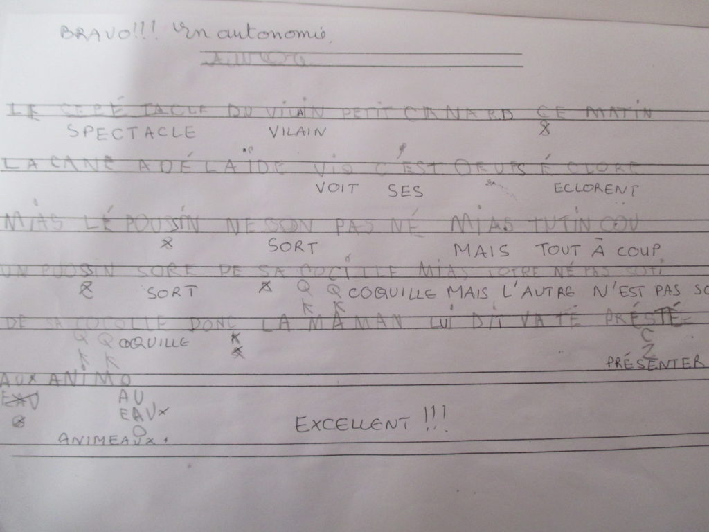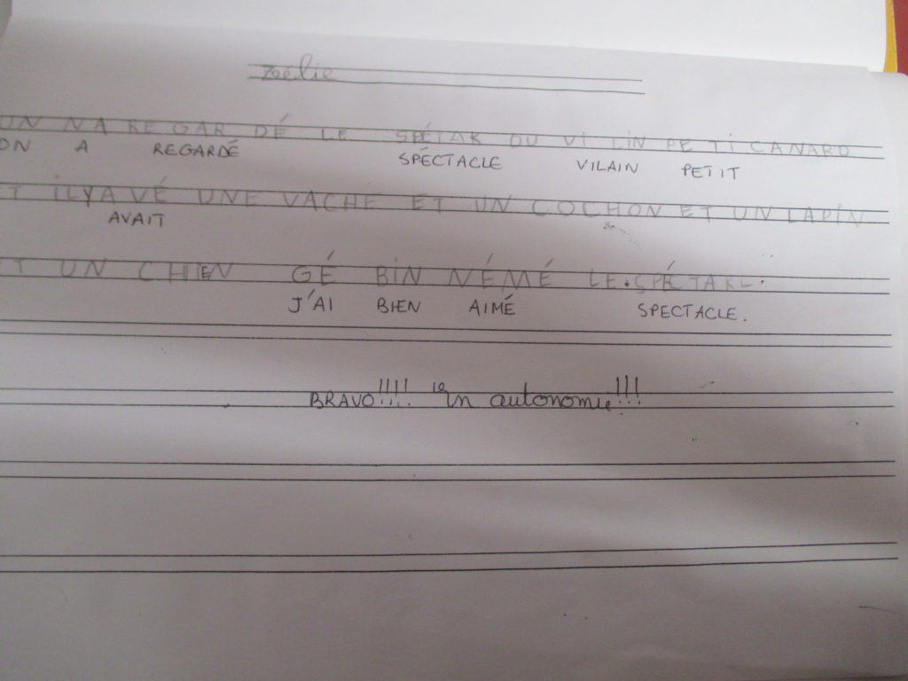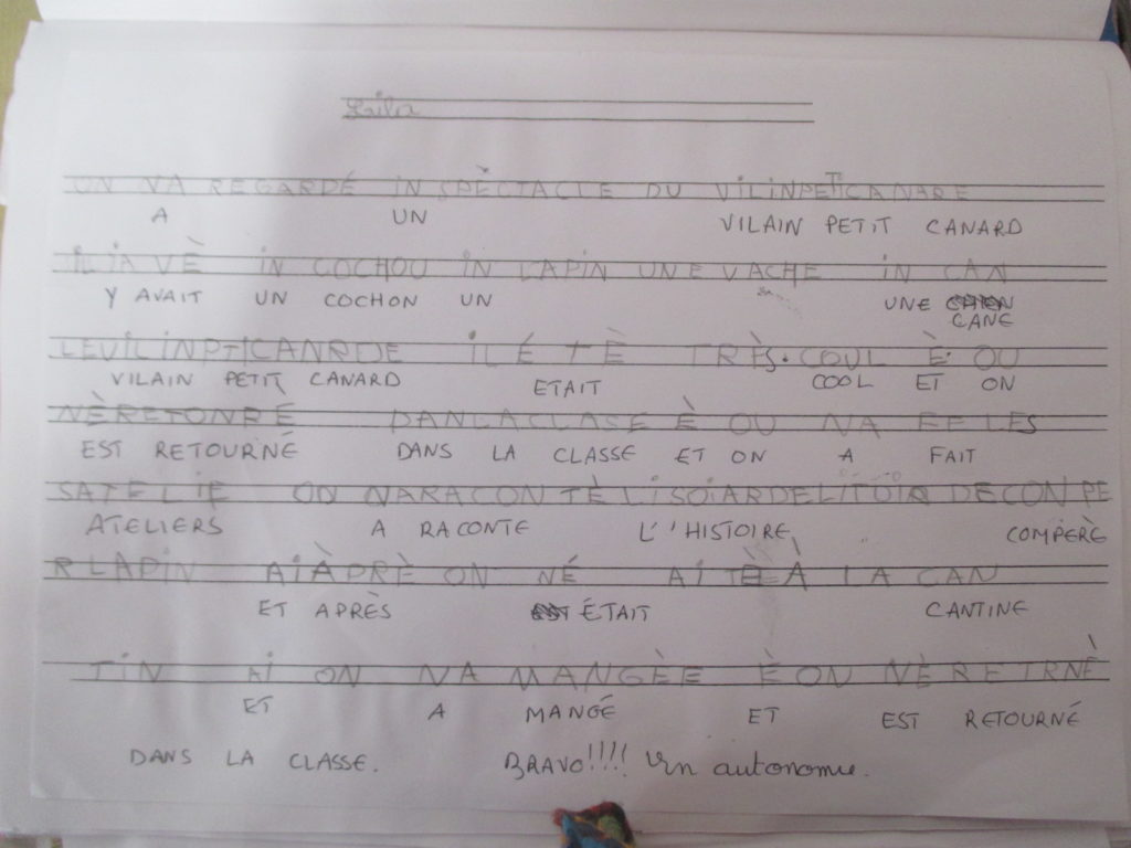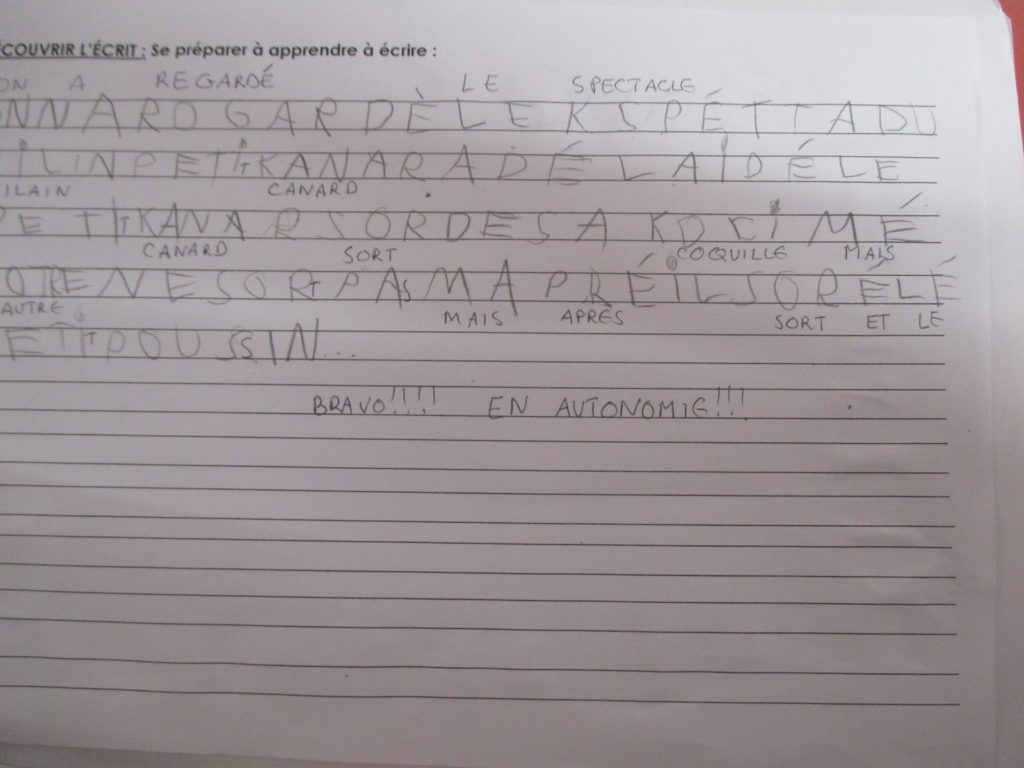 Les grands ont écrit en autonomie des petites phrases pour raconter l’histoire. Ils ont recherché les sons entendus dans les mots et les ont retranscrits à l’aide des lettres de l’alphabet, de vrais champions!!! BRAVO!!!