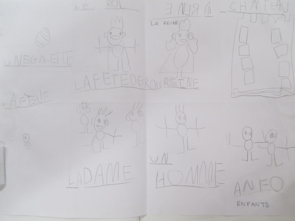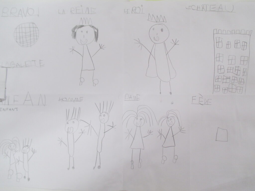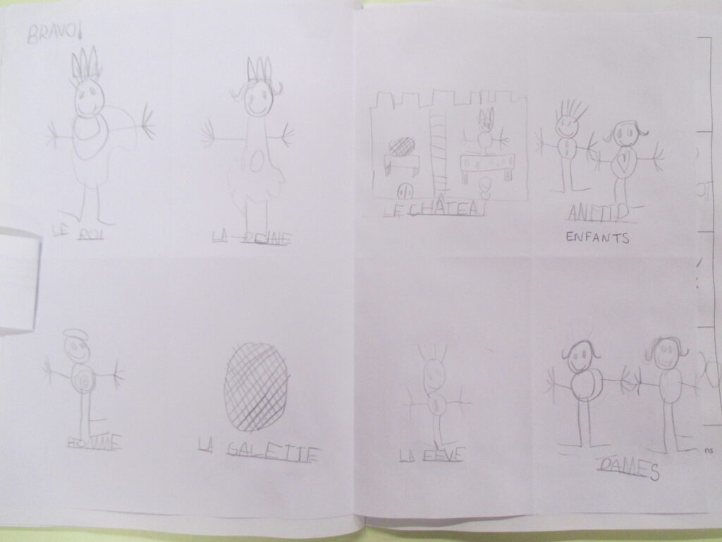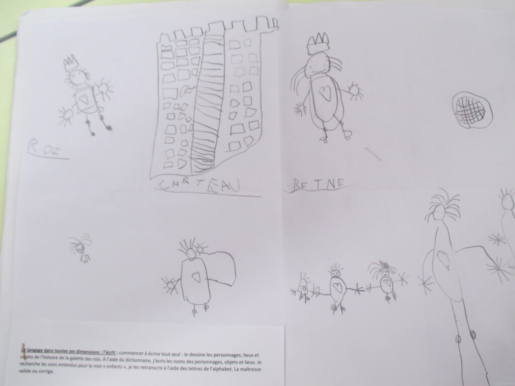 Dans la continuité du travail déjà réalisé à partir de l’histoire de la galette des rois, les élèves ont dessiné les personnages, lieux, objets.