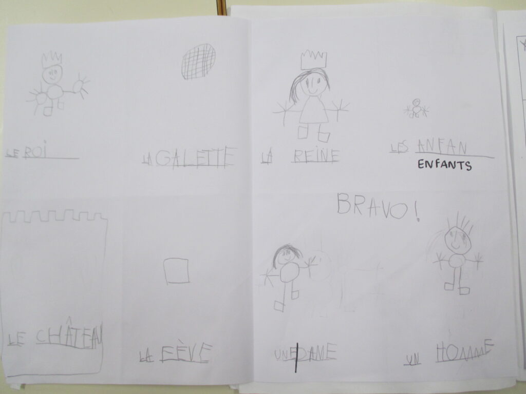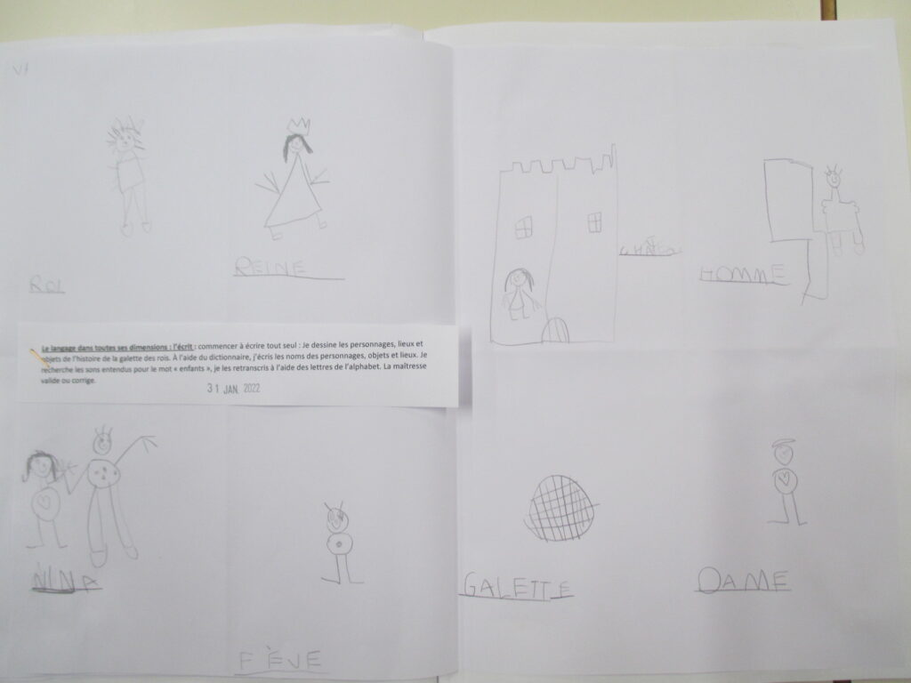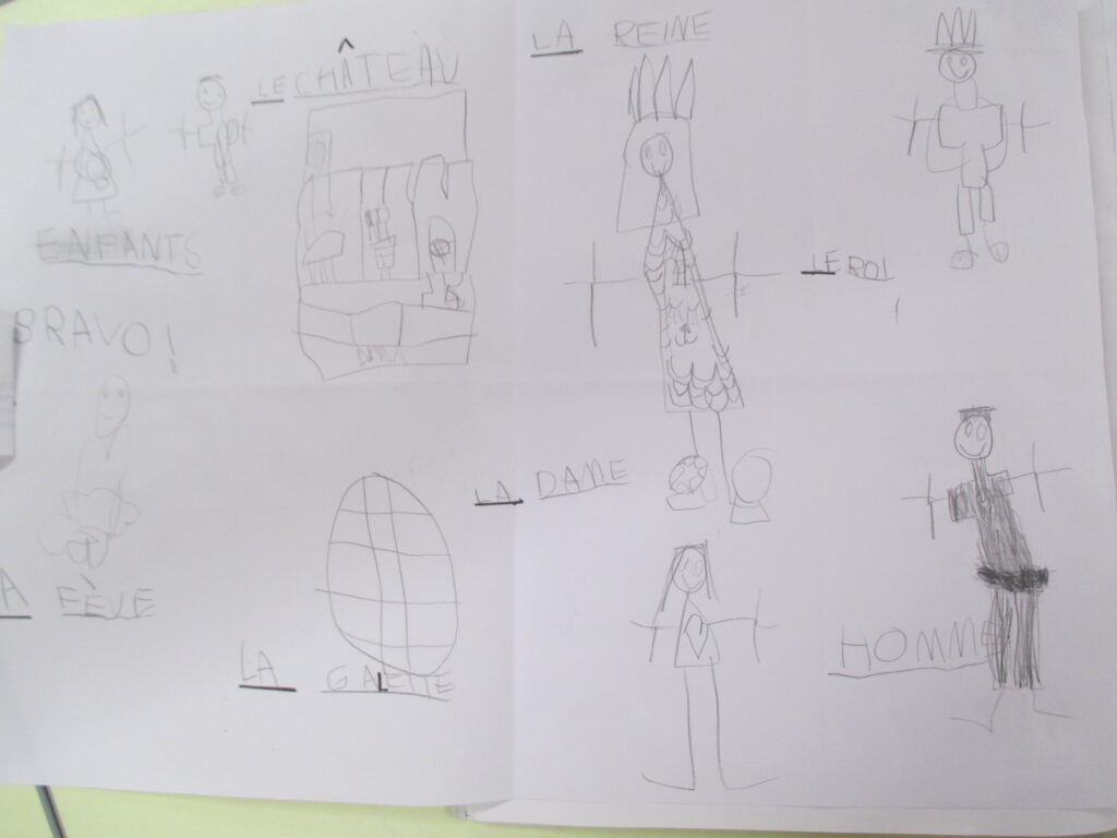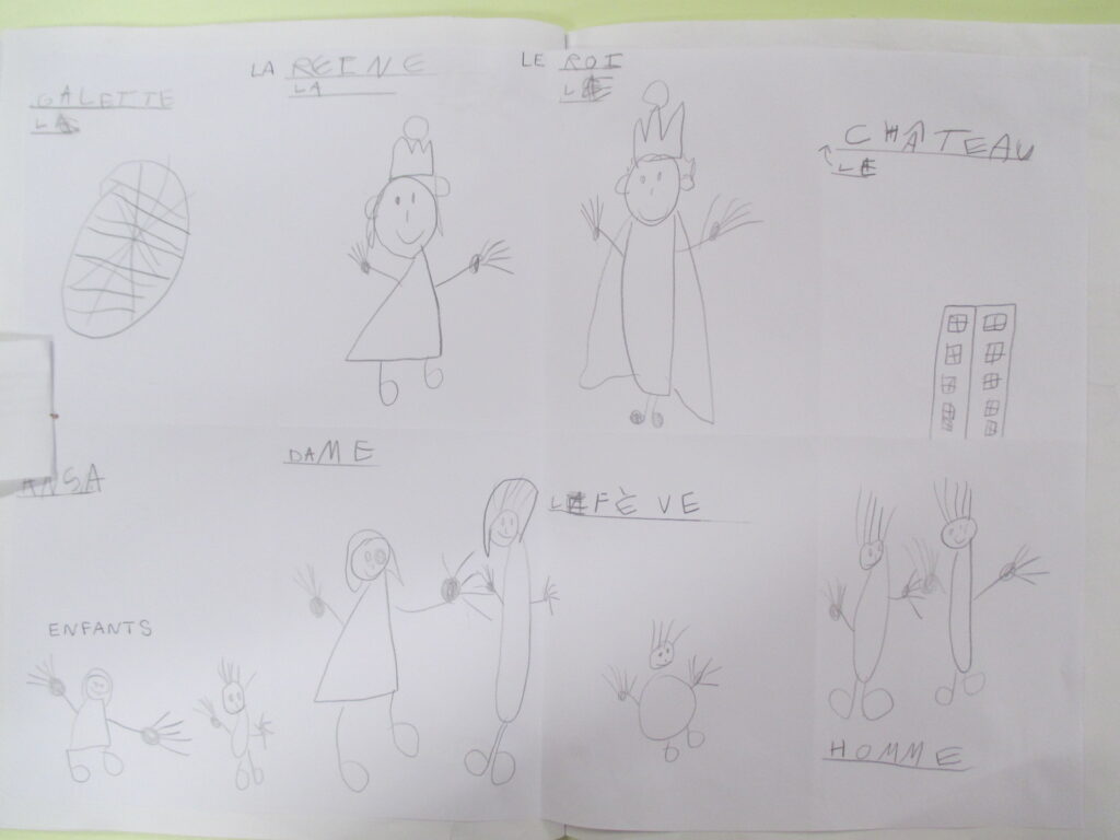 Dans la continuité du travail déjà réalisé à partir de l’histoire de la galette des rois, les élèves ont dessiné les personnages, lieux, objets.