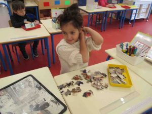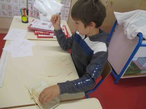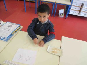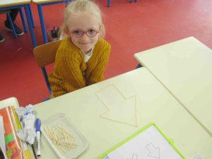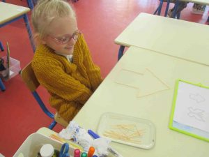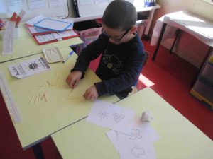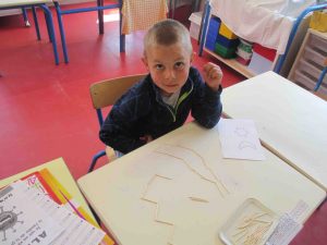 Ce changement n’a pas perturbé nos Grands! Les voici en photos lors d’une activité réalisée l’après-midi, des reproductions de motifs à l’aide de petits bâtons…