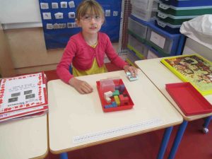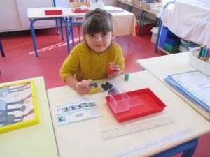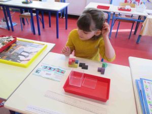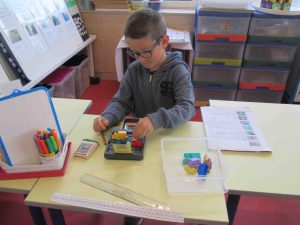 Chaque élève a son environnement de travail, sa table entourée de 2 autres tables pour poser le matériel. Cette organisation leur permet de respecter la distanciation. Cet agencement permet d’accueillir un groupe de 10 Grands.