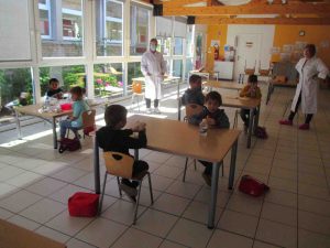 Toute notre équipe de petites mains a désinfecté pendant ce temps là les tables, les bancs, les toilettes quant à eux l’étaient au fur et à mesure du passage des enfants.