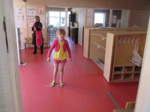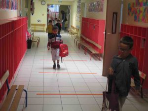 Ils sont ensuite allés en récréation. Chacun leur tour, ils ont pris leur manteau puis sont allés aux toilettes sans oublier le lavage des mains dont ils avaient bien parlé en classe! Ils ont attendu que tous aient fait ce petit rituel pour aller dans la cour rejoindre la maîtresse sous le regard vigilant des ATSEM, agents et maîtresses! Dans le couloir, ils ont découvert au sol des bandes installées tous les 1m50 pour permettre de visualiser l’espace de distanciation et se placer au bon endroit quand ils se déplaceront à plusieurs dans le couloir!