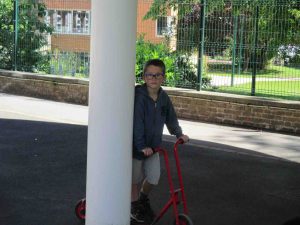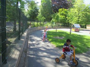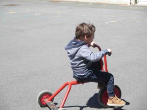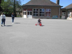 Dans la cour, les vélos, trottinettes étaient préparés! La cour pour eux seuls!!! Il a fallu rappeler le respect de la distanciation, mais l’après-midi, c’était déjà bien mieux!