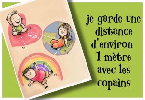 Après avoir échangé entre eux et avec les maîtresses sur ce qu’ils avaient envie de raconter de leur vie de confinement et de ce retour en classe, les nouvelles règles de l’école ont été présentées à l’aide d’affiches illustrant les gestes barrière: